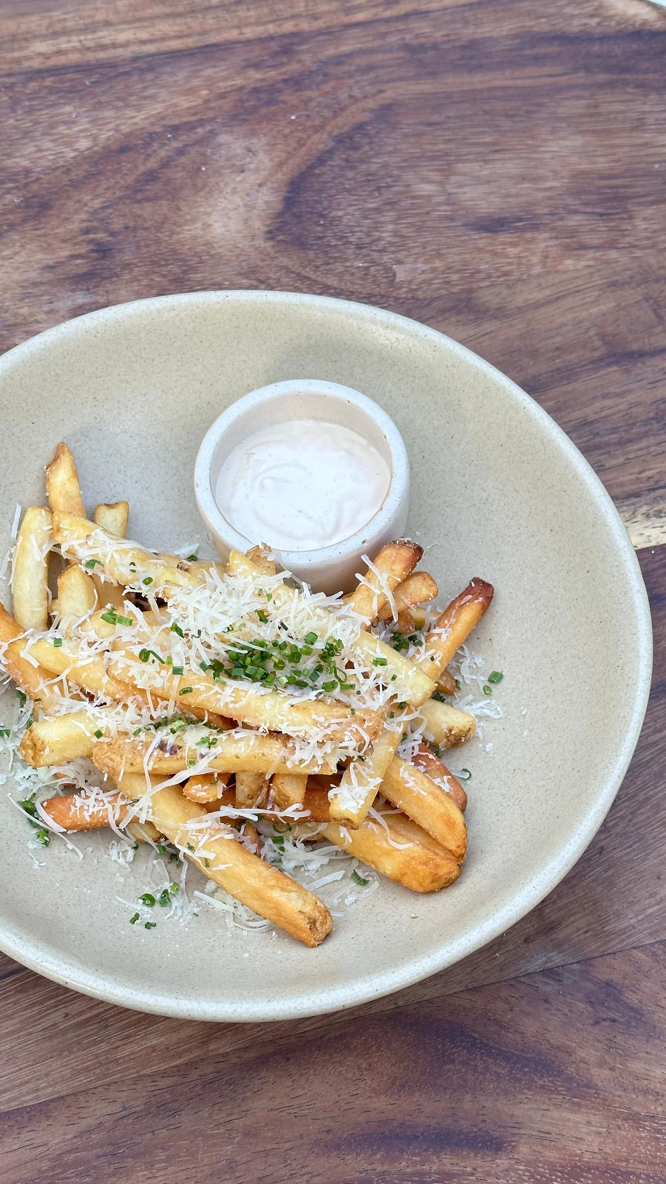 French fries with truffa oil, parmesan and habanero aioli. 220g. (vegetarian)